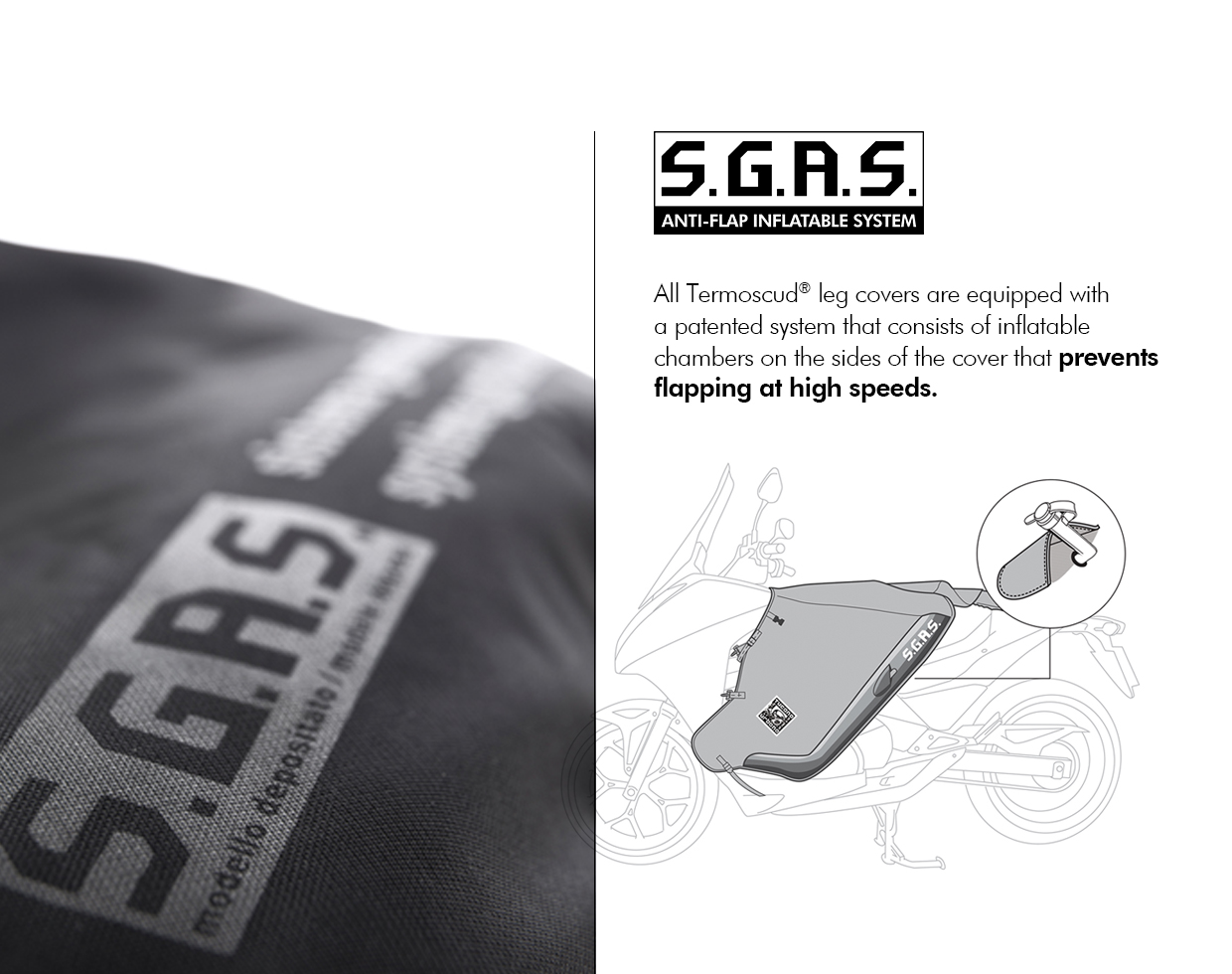 Оригиналното покривало за крака с ПАТЕНТОВАНА НАДУВАЕМА СИСТЕМА ANTI-FLAP (S.G.A.S.): надуваемите камери отстрани на покривалото предотвратяват пляскане при висока скорост.